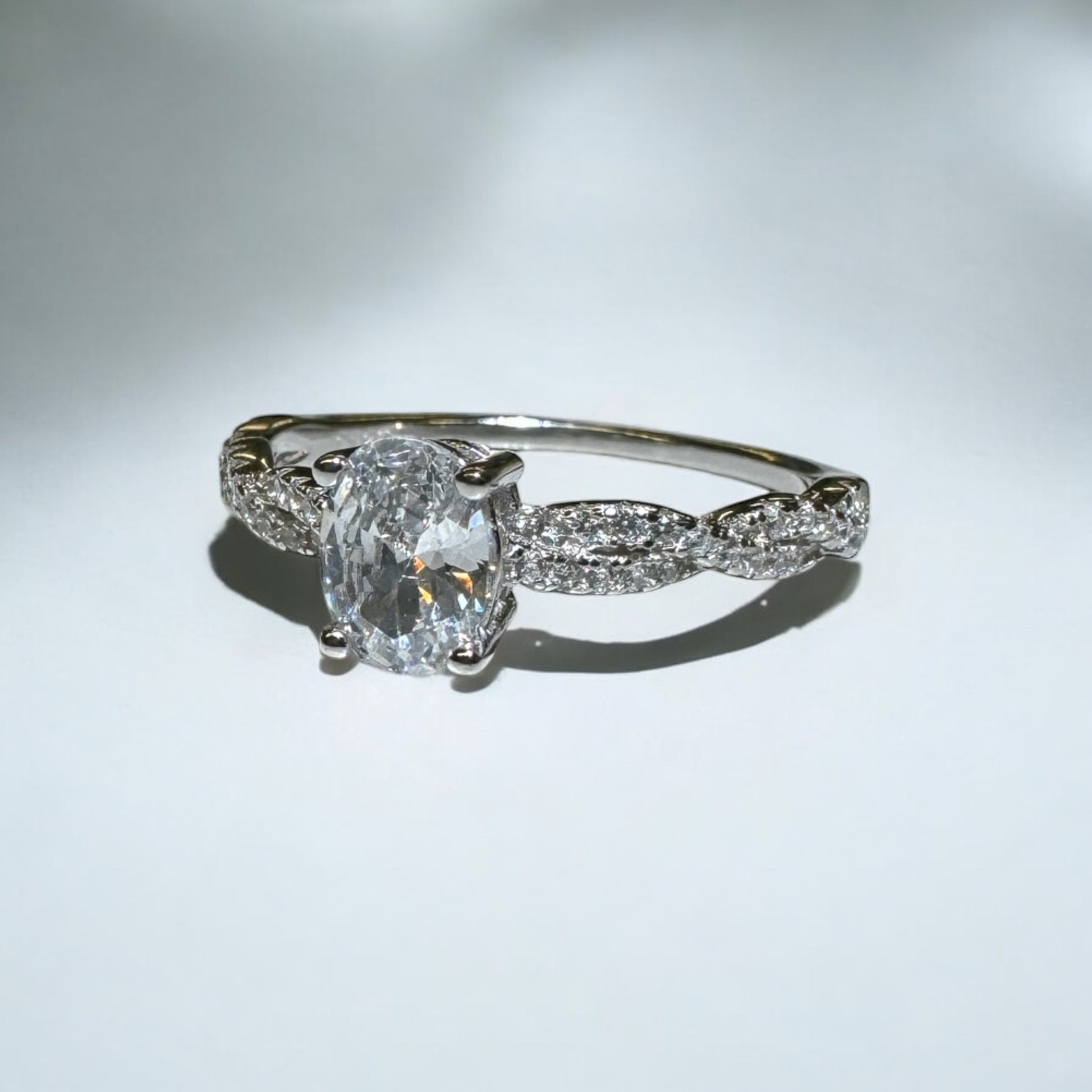 This ring features an elegant oval-cut zirconia stone, set on a 925 sterling silver band with delicately intertwined sparkling details. A refined design that captures the essence of Safir Charm.