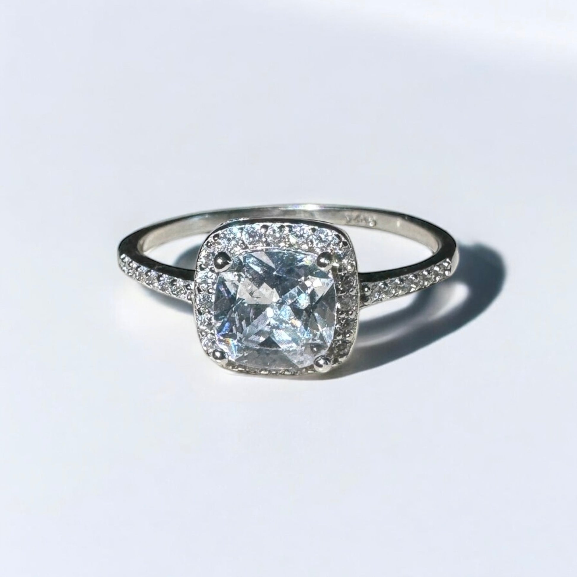 This ring captivates with its timeless elegance, featuring a dazzling cushion-cut zirconia stone set in a refined 925 sterling silver band. Encircled by delicate shimmering accents, the design exudes sophistication and brilliance. A statement of luxury and grace, embodying the essence of Safir Charm.